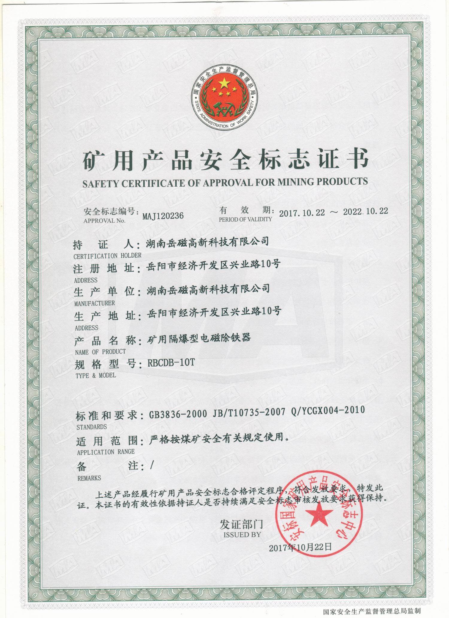 礦用產品安全標志證書